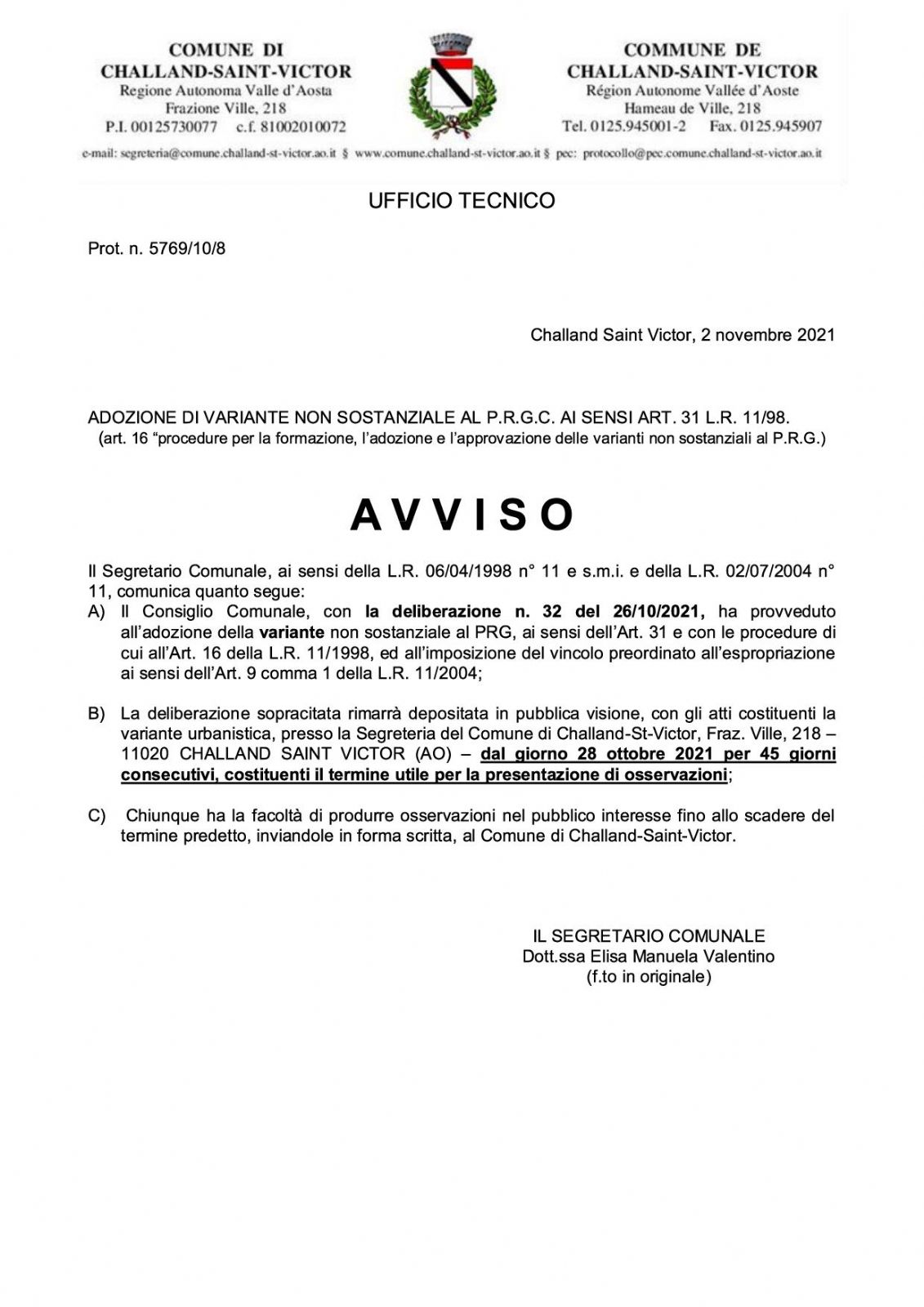 ADOZIONE DI VARIANTE NON SOSTANZIALE AL P.R.G.C. AI SENSI ART. 31 L.R. 11/98.