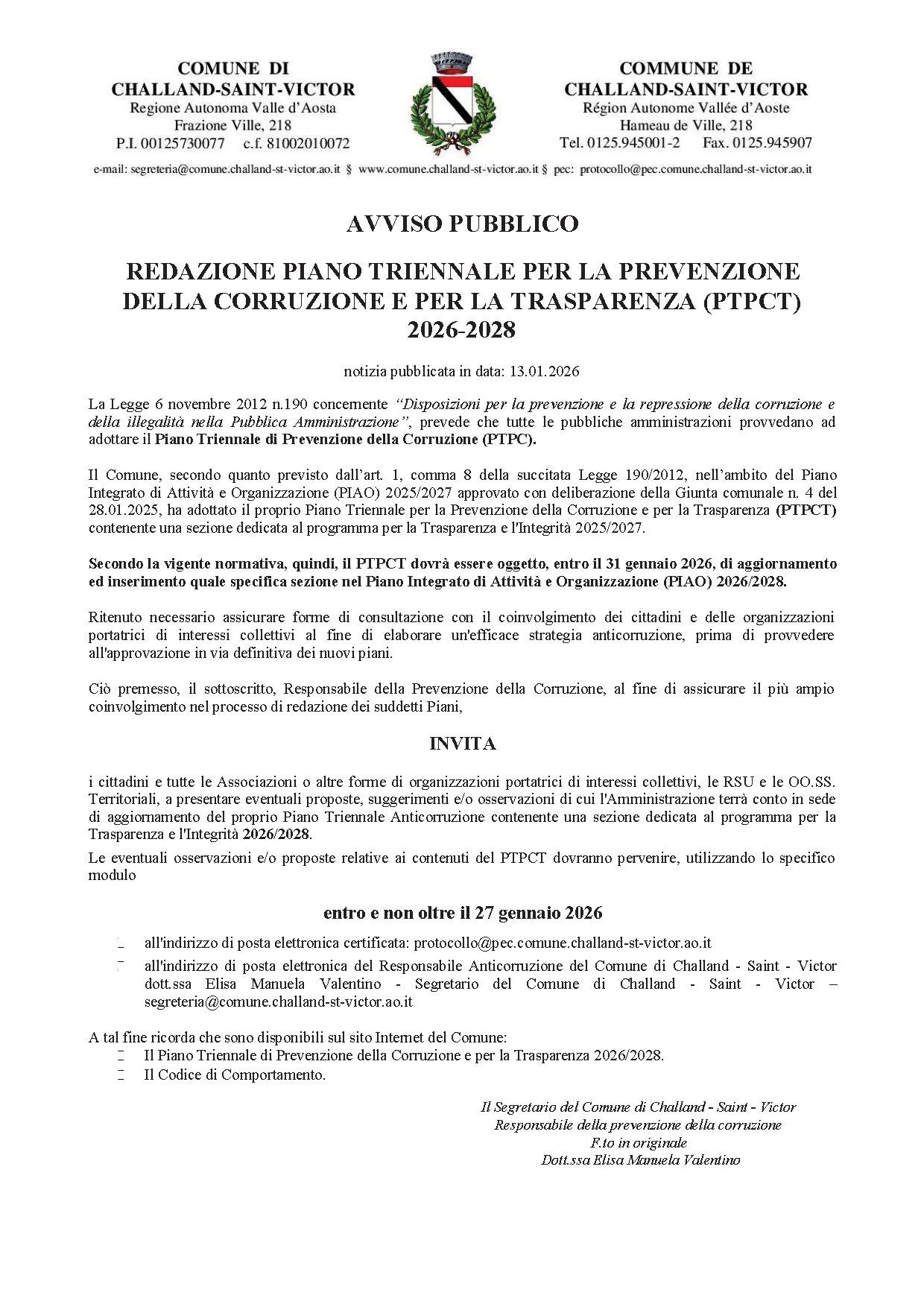 Avviso pubblico redazione piano triennale per la prevenzione della corruzione e per la trasparenza 20026/2028